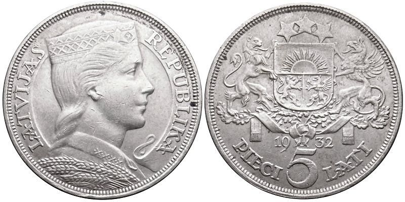 5 Lati 1932, 24.92g, KM.20/9, patina