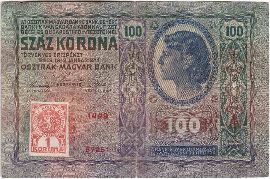 100 Koruna 2.1.1912, serie 1449, kolkovaná, Baj.5a, kolek střihaný, dole podlepená
