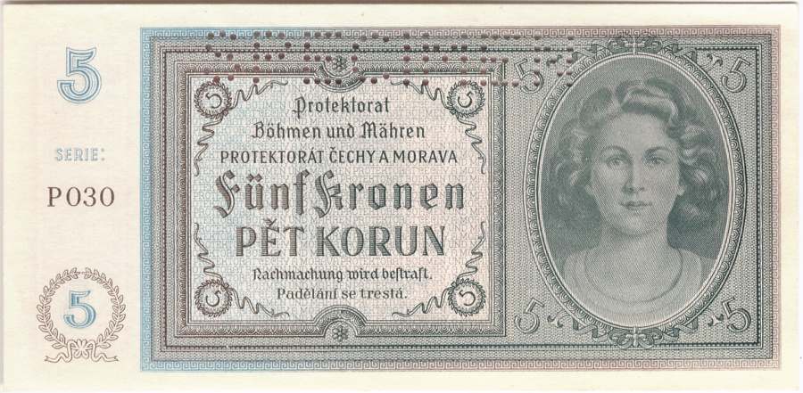 5 Koruna b.l. (1940), serie P030, perforace SPECIMEN, Baj.31