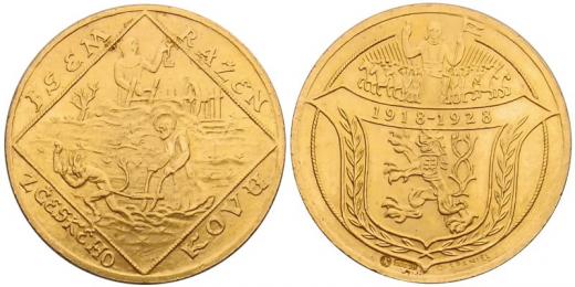 Španiel O. - čtyřdukátová medaile na 10 let ČSR 1928, Sign., Punc., Au 986, 28mm, 13.97g