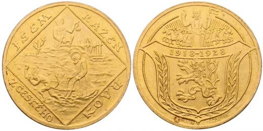 Španiel O. - dvoudukátová medaile na 10 let ČSR 1928, Sign., Punc., Au 986, 22mm, 6.99g