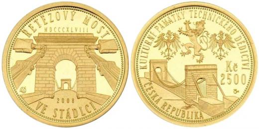 2500 Kč, 2008 Národní kulturní památka řetězový most ve Stádlci, Au 999, 7.78g