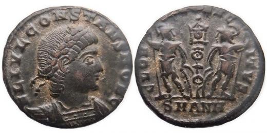 AE malý Follis, 2 vojáci 1 standarta, minc. Antiochia, 1.53g, patina