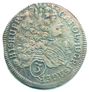 3 kr. 1716, Praha-Scharff MKČ -, av. bez okruží jako typ 18 29 / rv. bez okruží, koruna bez stuh, opis: ARCHID. AVST. DVX. B. ET. SIL. MAR. MOR. 1716. (nepublik. typ av. i rv.) "R"