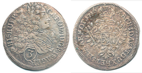 3 kr. 1716, Praha-Scharff MKČ -, av. bez okruží jako typ 18 29 / rv. bez okruží, koruna bez stuh, opis: ARCHID. AVST. DVX. B. ET. SIL. MAR. MOR. 1716. (nepublik. typ av. i rv.) "R"