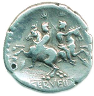 Denár, hlava Romy zprava, za ní věnec, dole X a ROMA R: Dioskurové na koních ve cvalu, zády k sobě C. SERVEILI Seaby 1_dír., hr., škr.