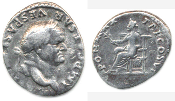 Denár, sedící Pax pozvedá olivovou ratolest, loktem se opírá o tr ůn PON MAX TRP COS VI RIC 90; S 2301