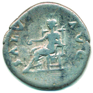 Denár, sedící Salus zleva drží obětní misku SALVS AVG RIC 522; Sear 2307