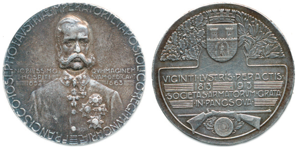 F.J.I., poprsí v uniformě čelně, latinský opis a 3-řádk. nápis NO BILISSIMO QVI MAGINEM........1852-1863 / 100 let vojenského spolk u 1813-1913 v Pancsova (Srbsko) sign.: Hans Schaefer Ag 35 mm 21,10 g "R"