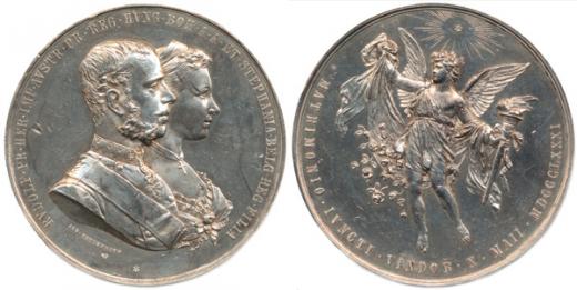 Rudolf a Stefanie, dvojportrét zprava, sign.:Tautenhayn / věno váno městem Vídeň k sňatku r.1881, stoj. Vindobona s pochodní Ag 55 mm 82,40 g "R" "krásná patina"_dr.úh.