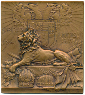 "VIRIBUS UNITIS 1914-1915", ležící lev zleva, pod ním rakouská a uherská koruna, za ním rakouský orel se znakem a nápisy sign. : F.Stiasny bronz 64x71 mm "R"