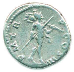 Denár, kráčející Mars nese válečnou trofej a oštěp PM TRP COS III S 3516; RIC 67