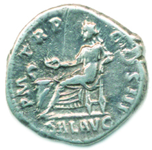 Denár, sedící Salus zleva, drží obětní misku a krmí hada na oltář i PM TRP COS III dole SAL AVG RIC 98; S 3525