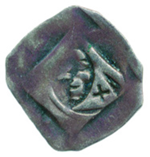 Fenik se čtyřrázem, hlava mnicha zleva s negativnm křížkem na kap uci / gotické majuskulní písmeno A mezi dvěmi trojlístky Rad. VIII/31