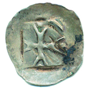 Obchodní haléř ze 14. století, ruka / kříž Sa 1364/607