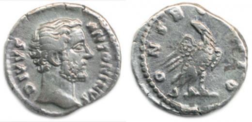 Denár posmrtný, hlava císaře zprava DIVVS ANTONINVS / orel stojíc í na oltáři CONSECRATIO S 5192; RIC 430-431
