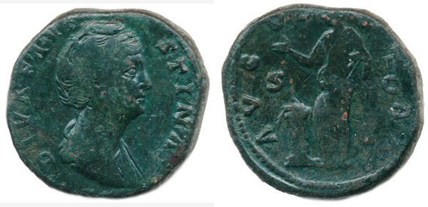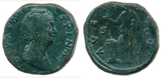 Sestercius, stoj.Pietas mezi písmeny S C u hořícího oltáře s nata ženou rukou bez obětní misky AVGVSTA RIC 1127