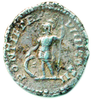 Denár, stoj.Mars drží kopí a opírá se o štít PONTIF TRP VIIII COS II Kank. 36, RIC 83