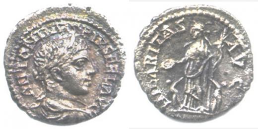 Denár, stoj.Hilaritas drží obětní misku a dlouhou palmovou ratole st, po stranách dvě děti HILARITAS AVG Sear 7517, RIC 190