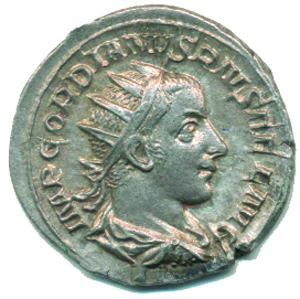 Antoninián, sedící Apollo zleva, drží olivovou ratolest a loktem se opírá o lyru PM TRP V COS II PP RIC 89; Sear 8648