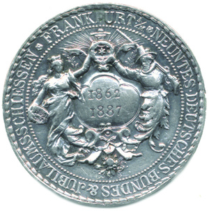 Frankfurt n.M. - IX. německé spolkové a jubilejní střelby 1862-18 87 / císařský orel a kolem osm štítů / Germania a střelec drží oz dobný rámeček s datací sign.: LAUER Ag 40 mm 26,70 g