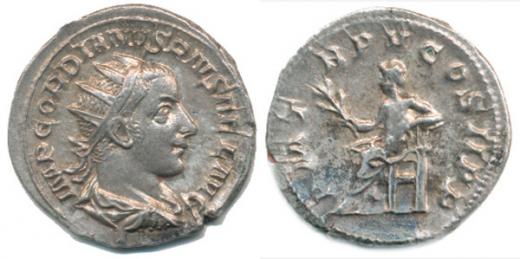Antoninián, sedící Apollo zleva, drží olivovou ratolest a loktem se opírá o lyru PM TRP V COS II PP RIC 89; Sear 8648