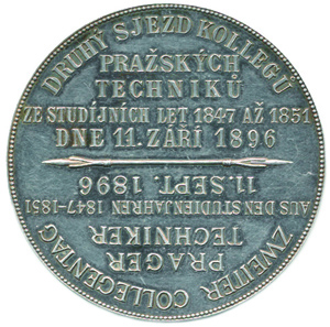 Druhý sjezd kolegů pražských techniků ze studíjních let 1847 až 1 851 dne 11.září 1896, česko-německé nápisy / stoj. Putti s tabulk ou a datací 1847-1851, v okruží znaky se šesti obory sign.: F.PAWLIK Ag 40 mm 23,10 g