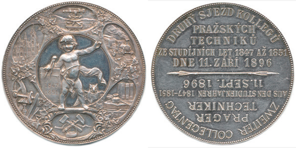 Druhý sjezd kolegů pražských techniků ze studíjních let 1847 až 1 851 dne 11.září 1896, česko-německé nápisy / stoj. Putti s tabulk ou a datací 1847-1851, v okruží znaky se šesti obory sign.: F.PAWLIK Ag 40 mm 23,10 g
