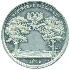"DEUTSCHES PARLAMENT 1848", dva stromy v krajině, uprostřed orel se stuhou s nápisem SEID/EINIG / před podstavcem s nápisem CONSTI TUTION si podávají ruce dva šlechtici, opis: VEREINIGUNG F'ÜR VOLKES...... sign.: Drentwett Sn 38 mm