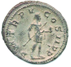 Antoninián, kráč. císař zprava ve vojenském oděvu nese oštěp a gl obus PM TRP V COS II PP RIC 93; Sear 8650