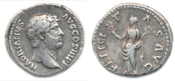 Denár, stojící Felicitas drží caduceus a olivovou ratolest FELICITAS AVG Seaby,Coh.614; RIC 234
