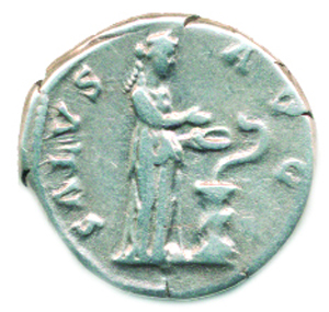 Denár, stojící Salus zprava, krmí hada na oltáři SALVS AVG RIC 267, Sear 3540