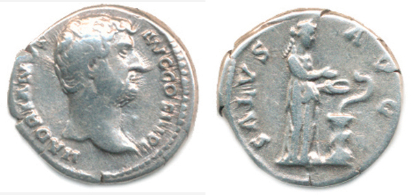 Denár, stojící Salus zprava, krmí hada na oltáři SALVS AVG RIC 267, Sear 3540