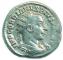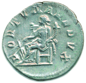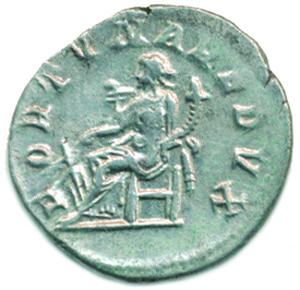 Antoninián, sedící Fortuna zleva drží kormidlo a roh hojnosti FORTVNA REDVX S 8613 var.; RIC 210