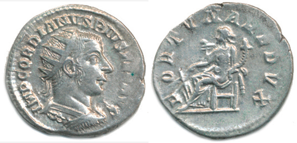 Antoninián, sedící Fortuna zleva drží kormidlo a roh hojnosti FORTVNA REDVX S 8613 var.; RIC 210