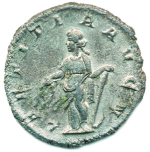 Antoninián, stoj.Laetitia drží věnec a kotvu LAETITIA AVG N RIC 86; Sear 8617