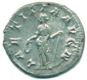 Antoninián, stoj.Laetitia drží věnec a kotvu LAETITIA AVG N RIC 86; Sear 8617
