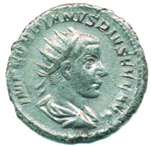 Antoninián, stoj.Laetitia drží věnec a kotvu LAETITIA AVG N RIC 86; Sear 8617_tém.