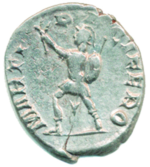 Antoninián, kráč.Mars ve zbroji drží oštěp a štít a pozvedá olivo vou ratolest MARTI PACIFERO RIC 212; S 8625