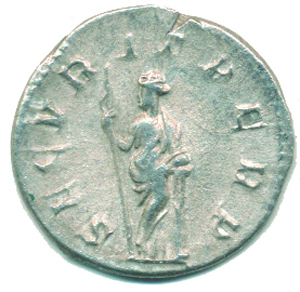 Antoninián, stoj.Securitas se zkříženýma nohama, drží kopí a opír á se o sloupek SECVRIT PERPET S 8660; RIC 151