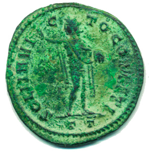 AE 23, stoj.Sol v levé ruce drží globus, pravou má pozvednutou IOVI INVICTO COMITI, v úseči TT_nález.patina