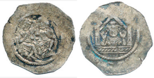 Denár C - 593 ac - značka "E" v poli chybí, kulička mezi sedící mi postavami_opis ned.
