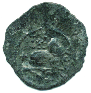Denár C -, poprsí knížete čelně s praporcem a štítem, v poli k řížek v tečkovaném kruhu / sedící postava zprava, před ní otevřen á kniha, zleva vznášejíci se andělé VP 246 (4 známé kusy) "RR" Šmerda -, Fiala -, SNS -,_tmavá patina
