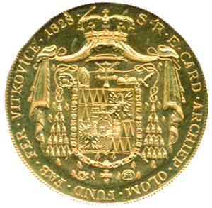 1 Dukát 1828 - Replika vydaná u příležitosti výročí založení VŽKG S.R.E.CARD.ARCHIEP.OLOM.FUND.FAB.FER.VITKOVICE.1828. Au 21 mm 3,49 gr "RR" (raženo 100 ks !!) minc. Jablonec bublina +orig. etue s logem VŽKG