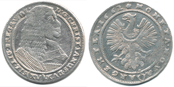 XV kr. 1662 b.zn., Volava Sa 429 opis: D:G:CHRISTIANUS.DVX.( )SIL.LIG.BREG & WOL._zc.nep.nedor., jinak