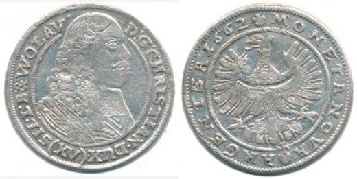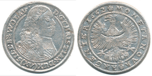 XV kr. 1662 b.zn., Volava Sa 429 opis: D:G:CHRISTIAN.DUX. () SIL.L.B. & WOLAV._dr.vada stř., tém.