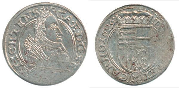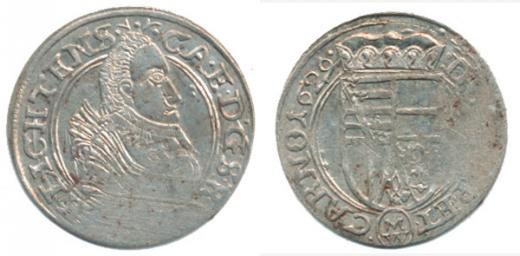 3 kr. 1629 MW SA - , jako 41 ale minc.zn. pod erbem / hodnot a pod poprsím "R"_část. nedor., jinak