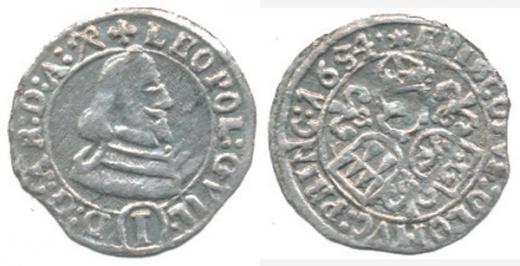 1 kr. 1654 S-V 111 B9/A5 nad hlavou křížek _kraj.stř., tém.