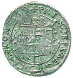 3 kr. 1669, zn.špice SV 322 E/B5 var.: úzké poprsí, za OLOMVCE NSIS: (dvojtečka)