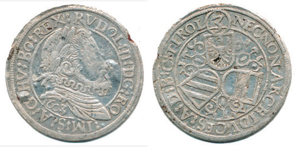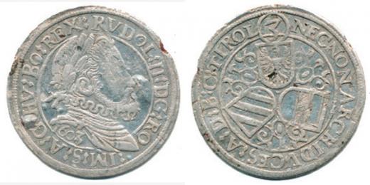 3 kr. 1603, Tyroly Hall jako MA tab. 11/ č. 25 ale nominál v k roužku; opis: RVDOL:II:DG:RO :IM:SA:A:G:HV:BO:REX: / ....D:B: C:TIROL "R"_dr.vada stř.